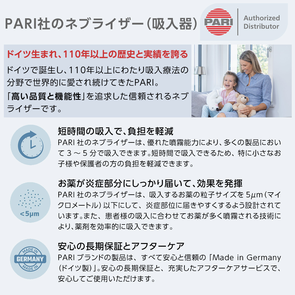 PARI社のネブライザーは、優れた噴霧能力により、多くの製品において3~5分で吸入できます。 短時間で吸入できるため、特に小さなお子様や保護者の方の負担を軽減できます。