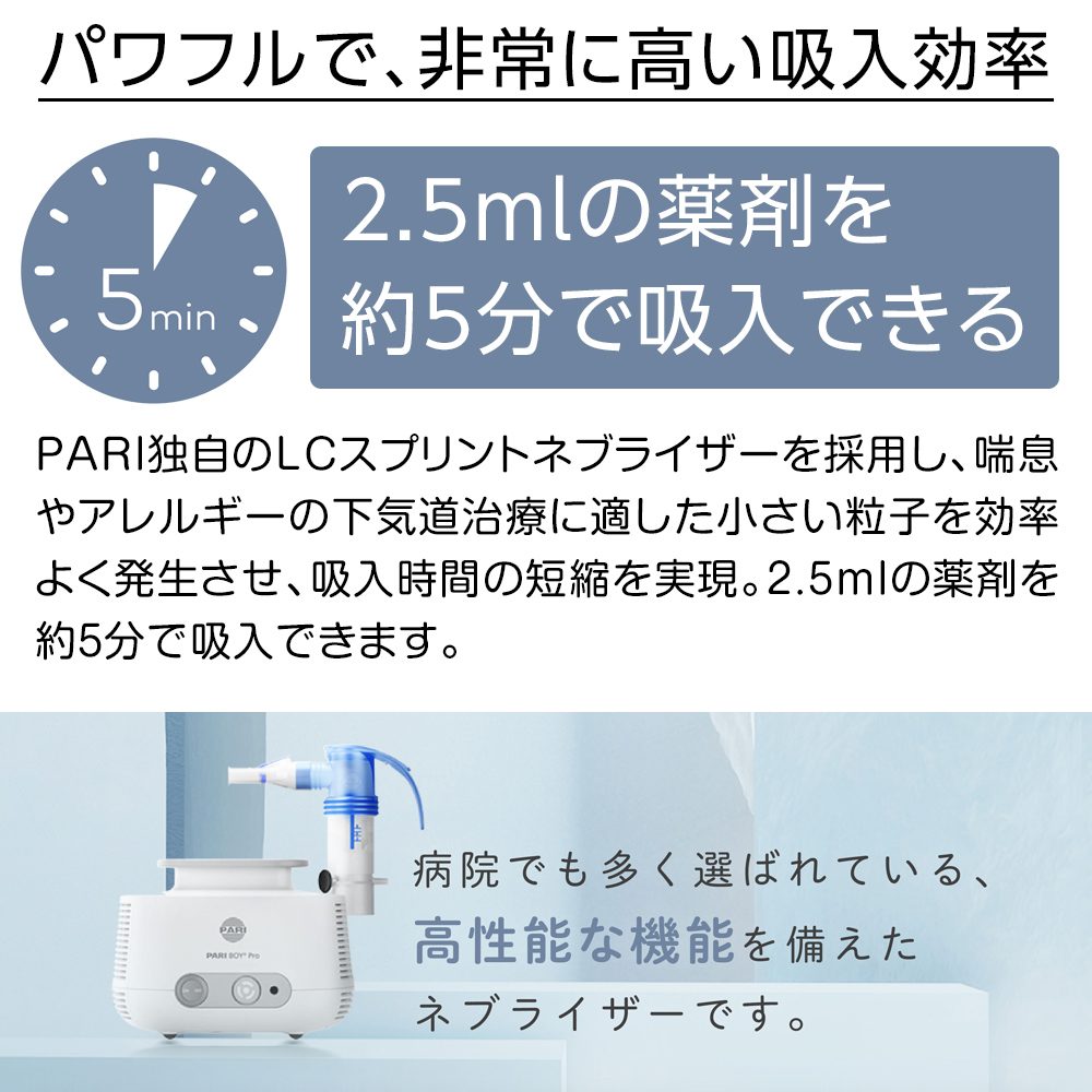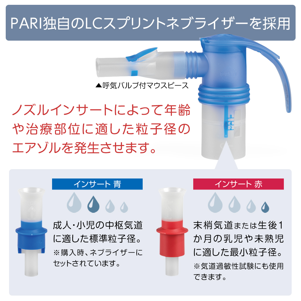 PARI独自のLCスプリントネブライザーを採用し、喘息やアレルギーの下気道治療に適した粒子を効率よく発生させ、吸入時間の短縮を実現。