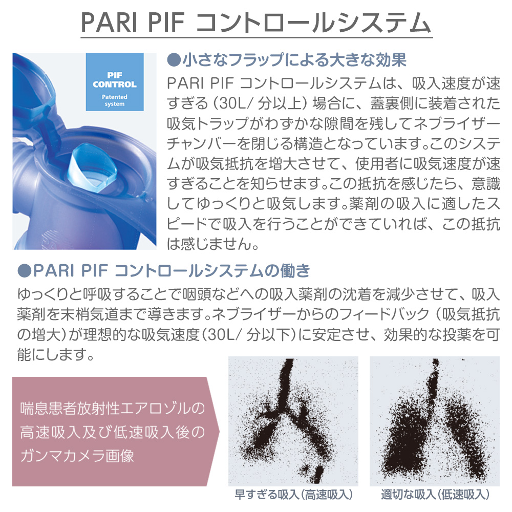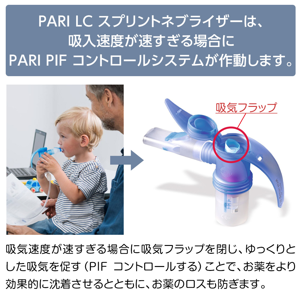 PARI LC スプリントネブライザーは、吸入速度が速すぎる場合、PARI PIF コントロールシステムが作動します