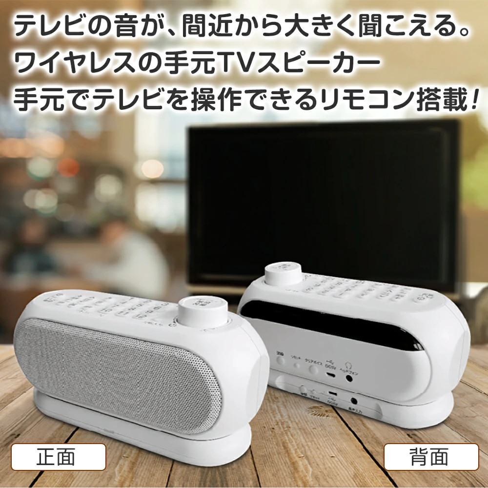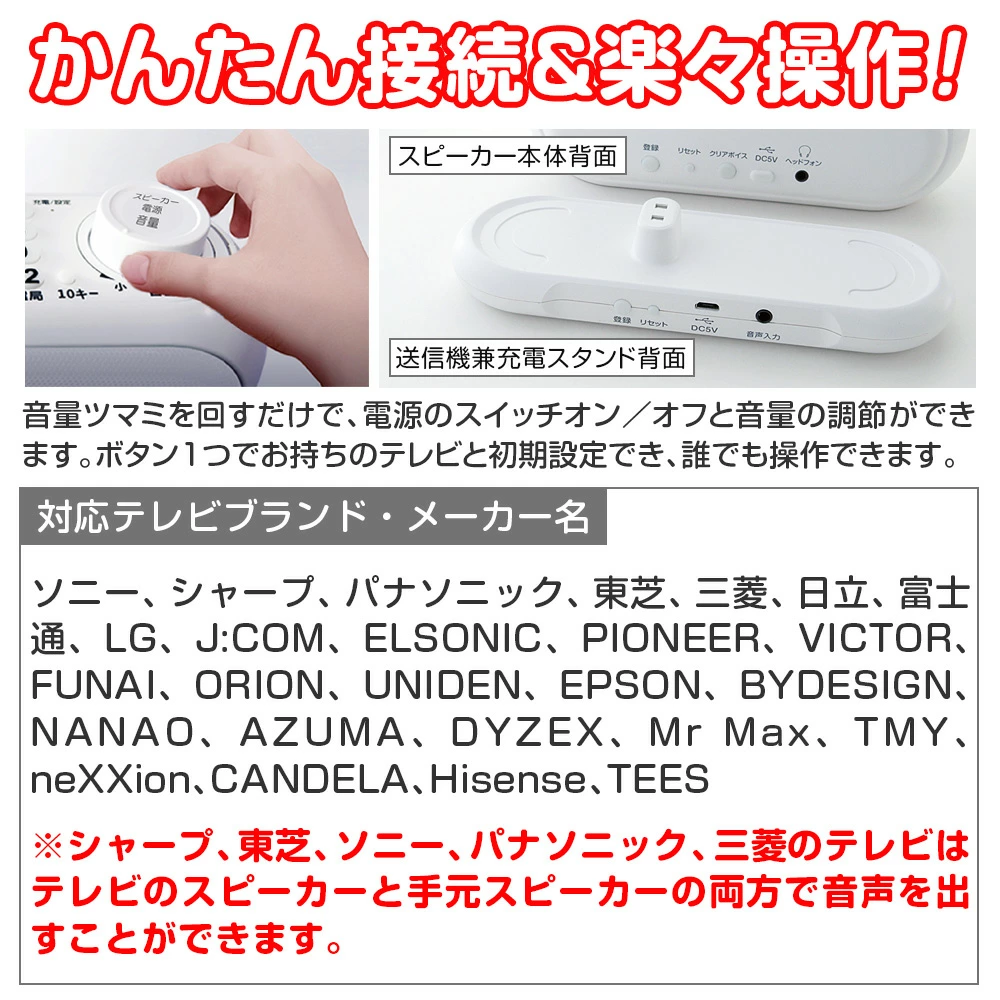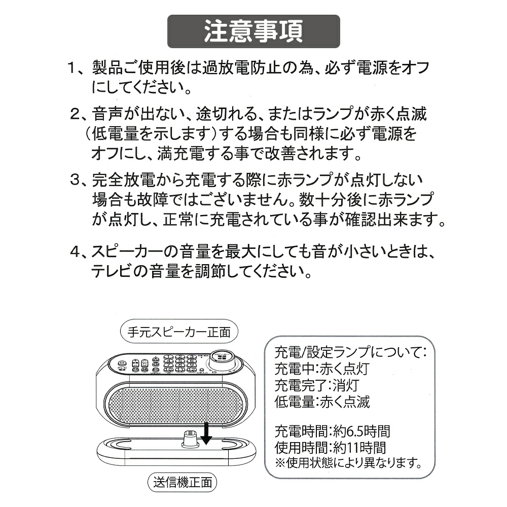 | 付属品 | リモコン付き手元スピーカー本体、専用送信機(兼充電用スタンド)、音声ケーブル、USBケーブル、専用充電アダプタ、取扱い説明書(保証書付) |