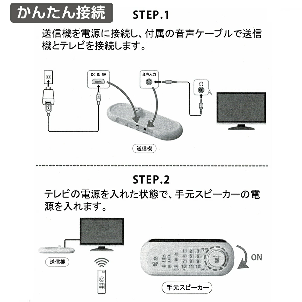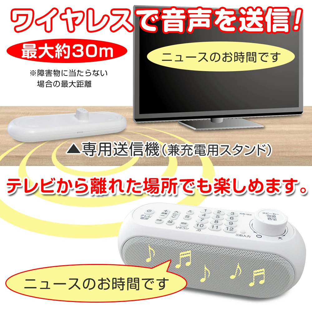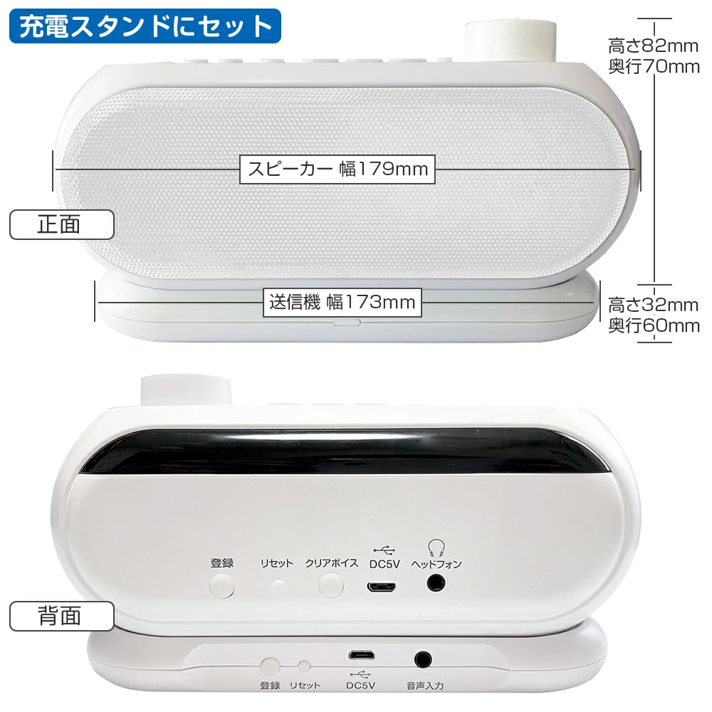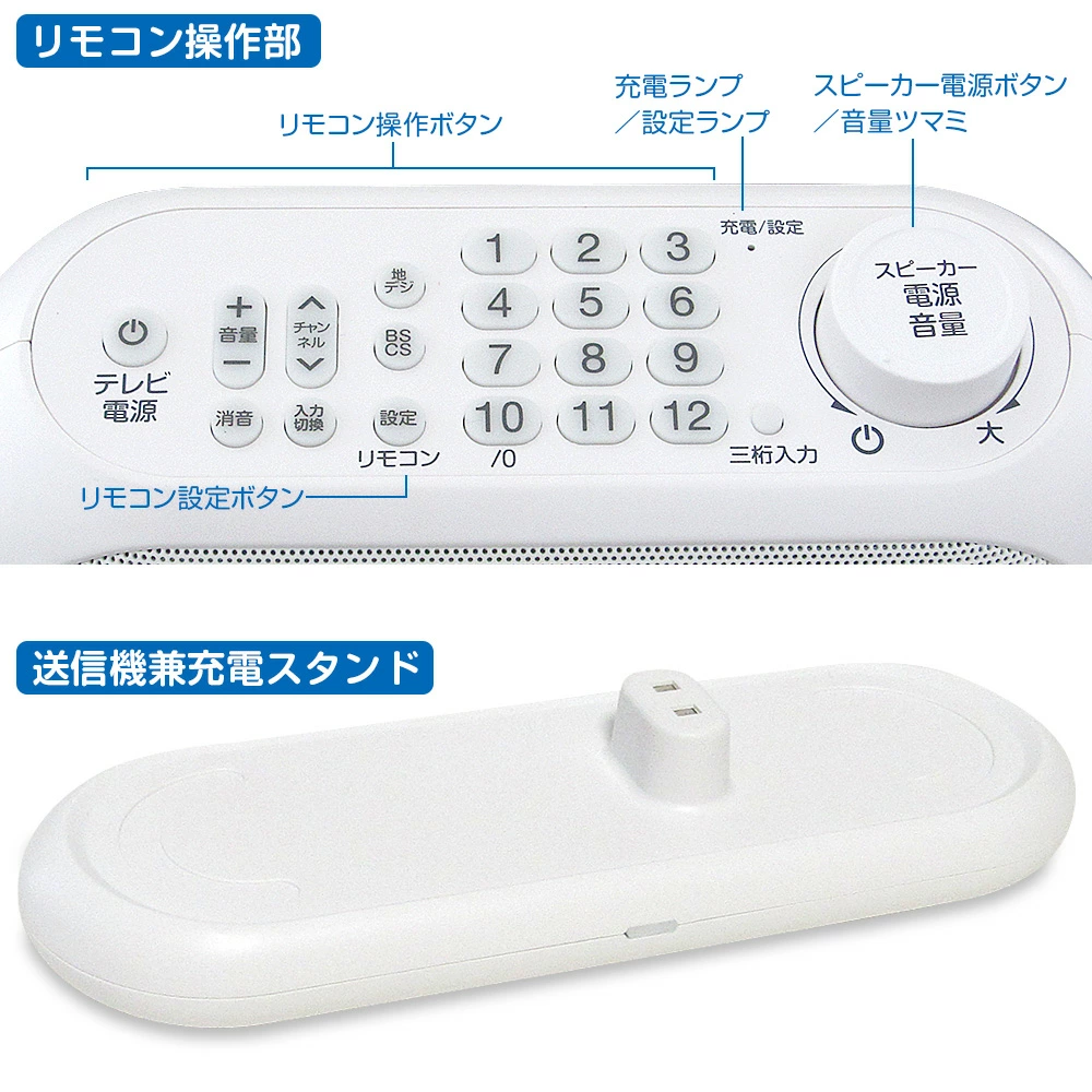 | 付属品 | リモコン付き手元スピーカー本体、専用送信機(兼充電用スタンド)、音声ケーブル、USBケーブル、専用充電アダプタ、取扱い説明書(保証書付) |